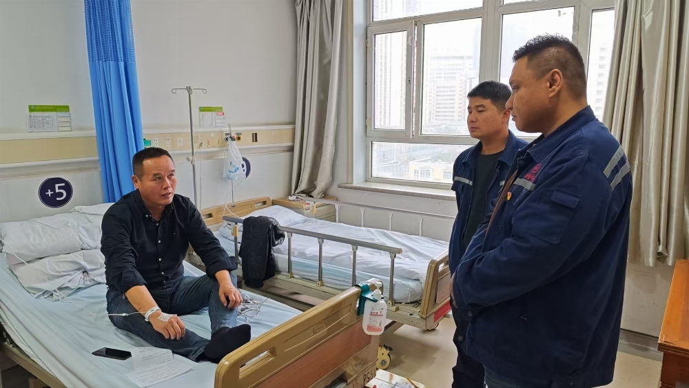 10月14日,秋意渐浓,新疆医科大学第六附属医院的呼吸与危重诊医学科病房内暖意涌动。维修中心(超越公司)二车间班子成员专程来到医院,带着精心准备的慰问品看望正在接受治疗的老职工汤训德,将车间“大家庭”的深切关怀与同事之间的牵挂,稳稳送到了病榻前。