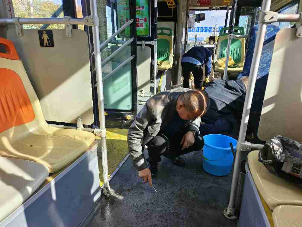 10月16日上午,经营一部头工公交车场,六车队班子带头,洗车班和各族职工主动参与,全员化身“保洁员”,对运营车辆的卫生死角展开集中深度清理行动,用双手为市民打造干净、舒适的乘车环境。各族干部职工利用线路运营停休间隙,纷纷拿起抹布、清洁剂、毛刷、钢丝球等,对运营车辆进行深度清洁,此次行动中重点针对老旧车辆卫生死角进行清理。车厢里,有人用毛刷刷地板,有人用钢丝球蹲在地板上刷座椅、暖气周边死角顽固污渍,有人用抹布仔细擦试着座椅和扶手凹槽纹路里的污泥,有人毛刷刷洗门台,有人在拆卸风扇;车厢外,有人在清洁电瓶仓,有人在洗轮毂,有人在擦挡风玻璃……