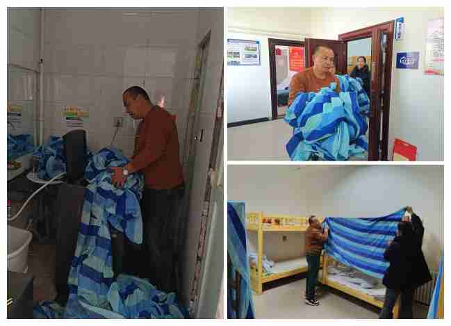 10 月 27 日,党员们迅速分组,各司其职,以饱满的热情投入到工作中,活动现场一片热火朝天的景象。拆被套的党员手法娴熟,厚重的被套在他们手中迅速“脱壳”;拆枕套的党员则小心翼翼,像呵护珍宝一样,生怕弄脏了枕芯。床单、被褥被一件件抱出,送往清洗处。