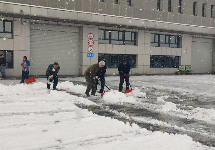 四车间全体干部职工迅速集结到场区各关键区域,没有繁琐的动员,只有实干的身影。班子成员与职工们并肩作战,纷纷拿起铁锹、推雪板等工具,以饱满的热情投入到扫雪工作中。寒风中,脸颊被冻得通红却丝毫没有退缩,额头上的汗珠凝结成霜,又在持续的劳作中化作热气,忙碌的身影在皑皑白雪中来回穿梭,成为场区里最温暖、最动人的画面。