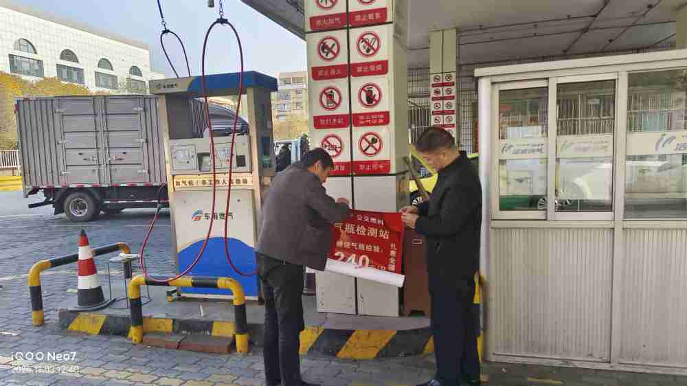 为进一步拓展气瓶检测市场、提升业务知晓度与经营收入,11月4日至5日,燃料公司创新宣传模式,设计印制一批气瓶检测业务宣传海报,组织机关管理干部在 15 家合作加气站同步张贴,精准触达气瓶车辆用户群体。