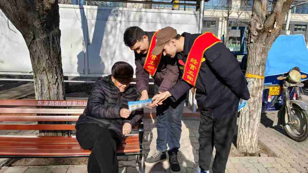 在人民广场东公交站点,佩戴经营二部“红石榴”绶带的志愿者魏征顶着寒风坚守岗位,提前整理好印有“平安出行 文明交通”的宣传手册,向过往乘客有序分发并细致讲解。魏征注意到一位老年乘客推着装满菜的小推车缓缓走来。他立即快步上前,一手接过老人的推车,一手搀扶老人,面带微笑轻声询问:“大爷,您要乘坐几路车呀?天气冷,您慢点走,我扶着您到安全区域候车……”