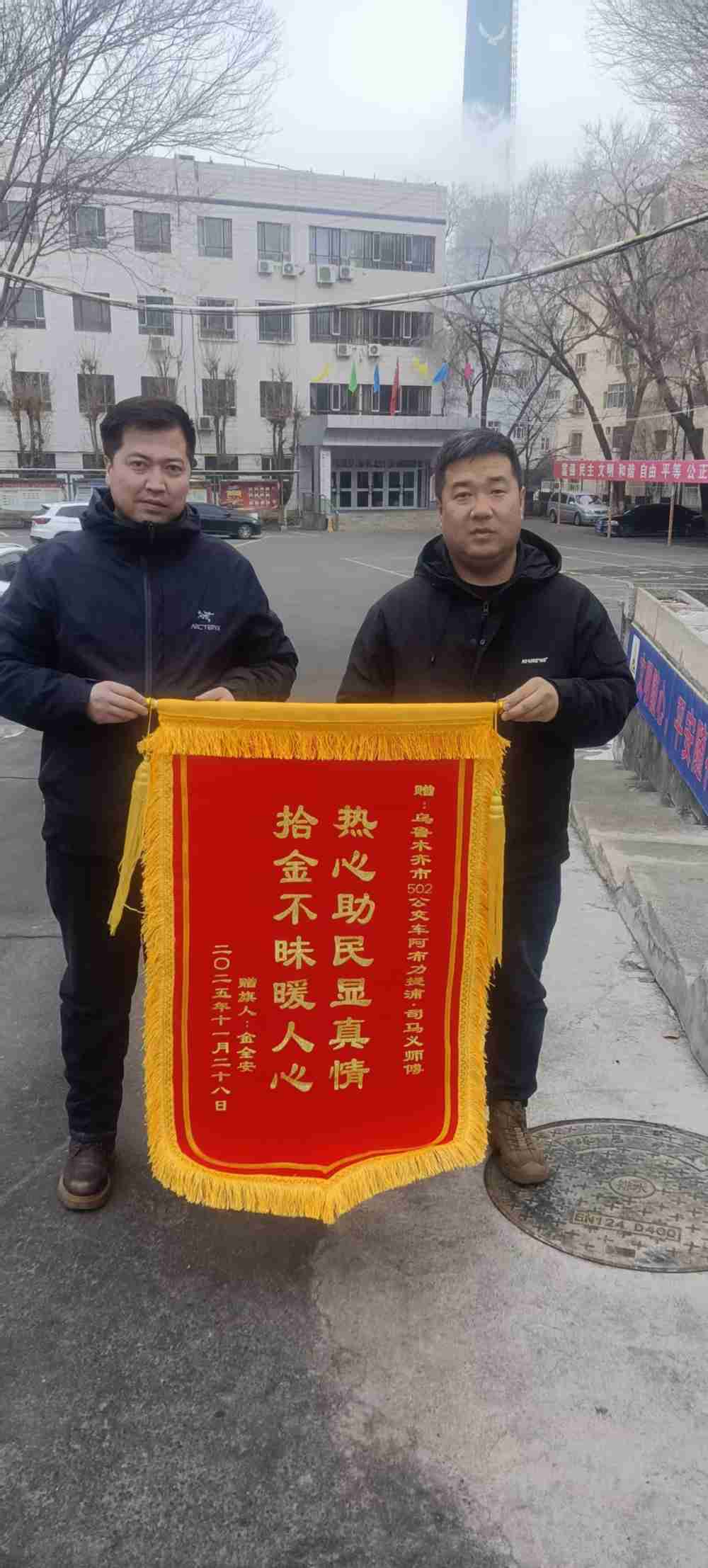 金先生专程前往调度站领取失物,在核对物品无误后,他紧紧握住阿布力提甫·司马义同志的手再三致谢。据金先生介绍,当日他乘坐502路公交上班,下车时因匆忙不慎将随身包遗落,发现物品丢失后万分焦急,这些证件日常生活中使用平凡,补办起来还需要花时间,本以为找回无望,没想到公交驾驶员如此负责、高效。为表达对阿布力提甫·司马义同志及车队的感激之情,金先生特意定制了印有“拾金不昧暖人心 热心助民显真情”的锦旗送到车队,对公交人员的优质服务和高尚品德给予高度赞扬。
