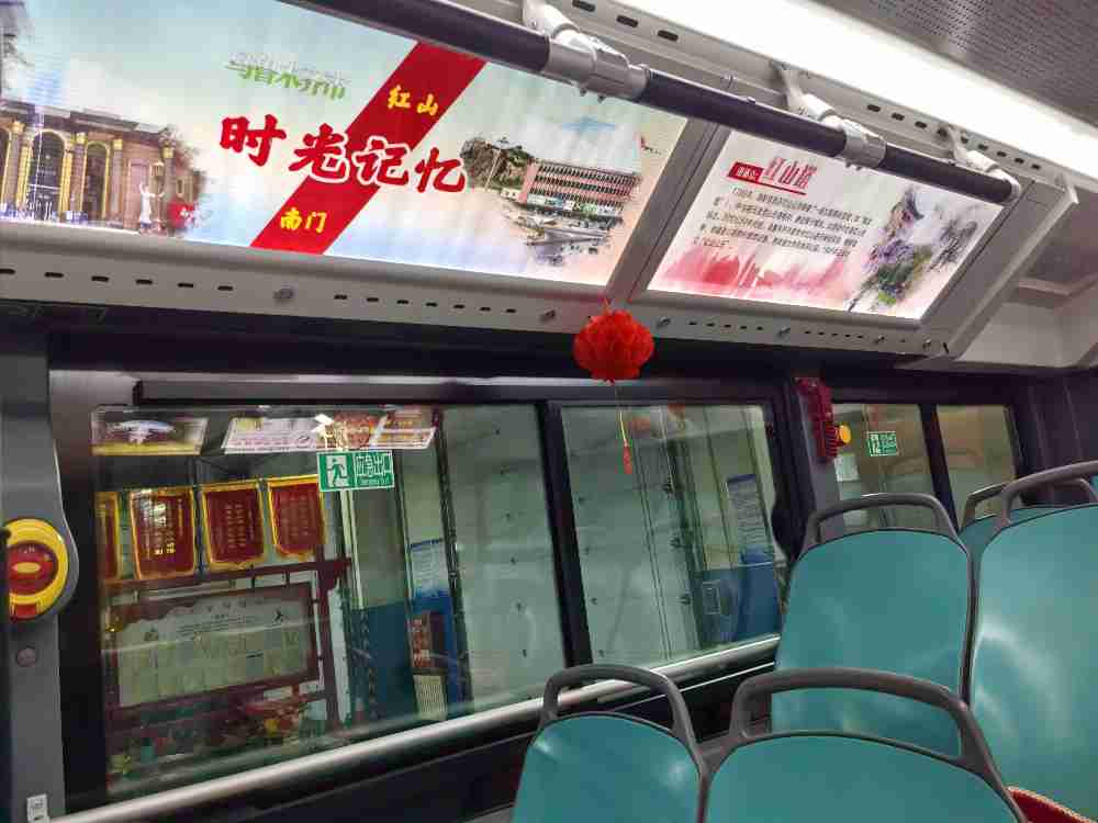 车厢内部的文化布置更是独具匠心,让每一段行程都成为穿越时光的文化体验。车内刊板打造“城市印记”专区,通过生动的今昔对比图,直观呈现1路公交途经地标的变迁轨迹:南门商圈从1990年代喧闹的小商品市场,蜕变为如今业态丰富的现代化商业综合体;人民公园从早期市民休憩的简易绿地,升级为承载文化活动、凝聚城市活力的文化中心,熟悉的场景变迁引发乘客强烈情感共鸣。座椅旁的车厢边板和拉环化身“暖心记忆卡”,集中展示近年来暖心1路驾驶员的精神风貌,办实事、做好事、志愿服务、美化环境等鲜活画面,那些搀扶老人、帮助乘客、紧急救助的温情瞬间,让十米车厢成为传递正能量的窗口,展现着公交人的责任与担当;车窗上的“时光画卷”按历史时间轴依次铺展,1950年代的老式无轨电车、早期线路的纸质站牌、驾驶员手写的调度记录复刻件等珍贵影像,清晰勾勒出1路公交与城市共生共长的发展脉络。