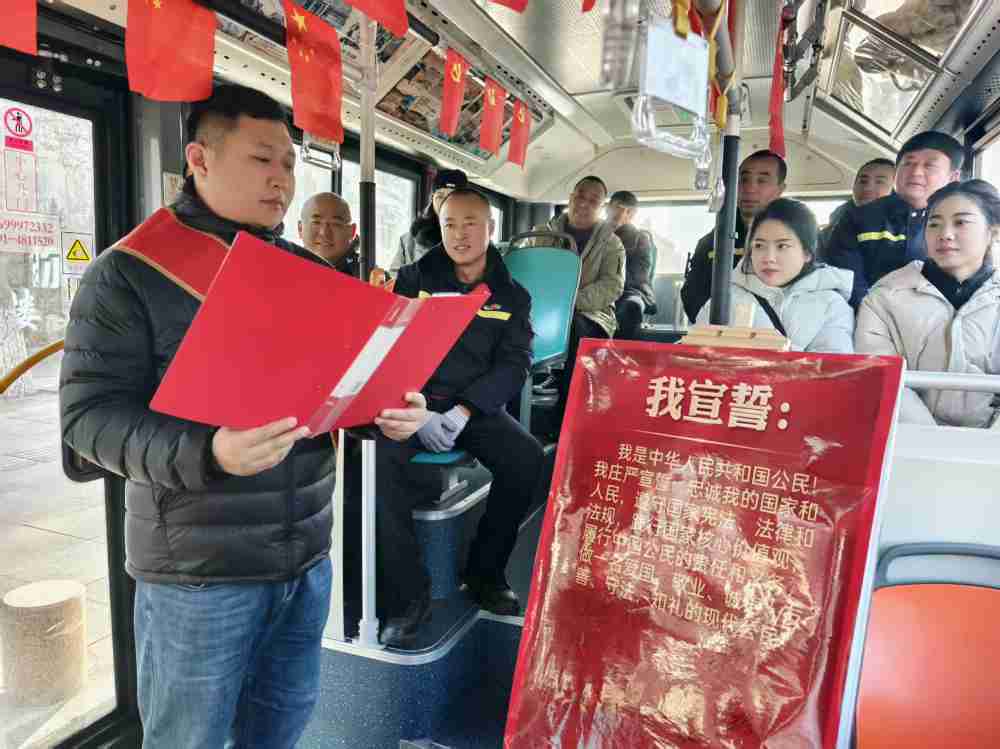 “忠于中华人民共和国宪法,维护宪法权威……”12月4日,第十二个国家宪法日当天,铿锵有力的誓言回荡在公交站上空。正值“宪法宣传周”,公交集团经营六部联合后勤服务中心,在2路法治宣传主题车厢内开展“弘扬宪法精神,护航公交出行”主题活动,以“宣讲+互动+体验”的多元形式,让宪法知识融入市民出行的每一段路程。