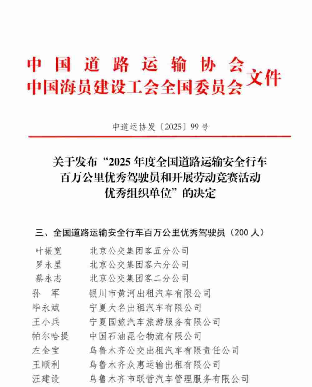 喜报:公交出租又荣获国家奖项——全国道路运输安全行车百万公里优秀驾驶员奖