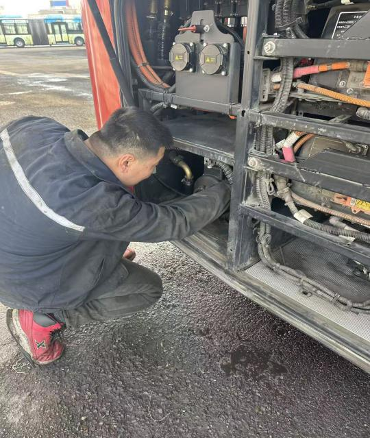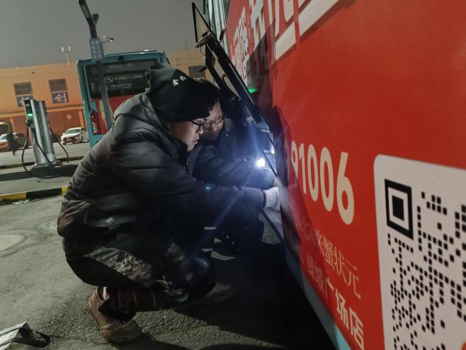 检修场地设在室外场站,凛冽寒风裹着寒意直钻衣襟。为保证检修精准度,修理工们无法穿戴过厚手套,只能徒手操作工具——手指很快冻得通红僵硬,连握稳扳手都变得吃力。可没人停下,大家搓搓冻僵的手、哈几口热气,便再次俯身钻入车底、爬上车身,继续排查管路接口密封性、紧固松动线束、调试锅炉制热功率。面对车辆数量多、检修任务重的压力,团队主动延长作业时间、放弃午休,始终以严谨细致的态度,不放过任何一处细微隐患。