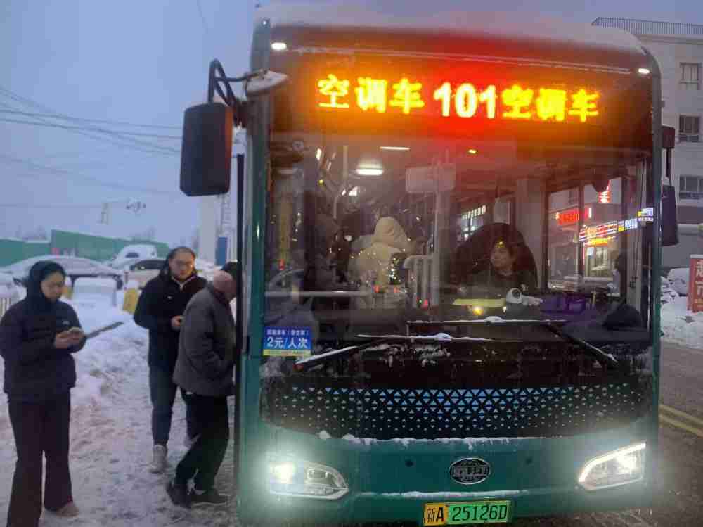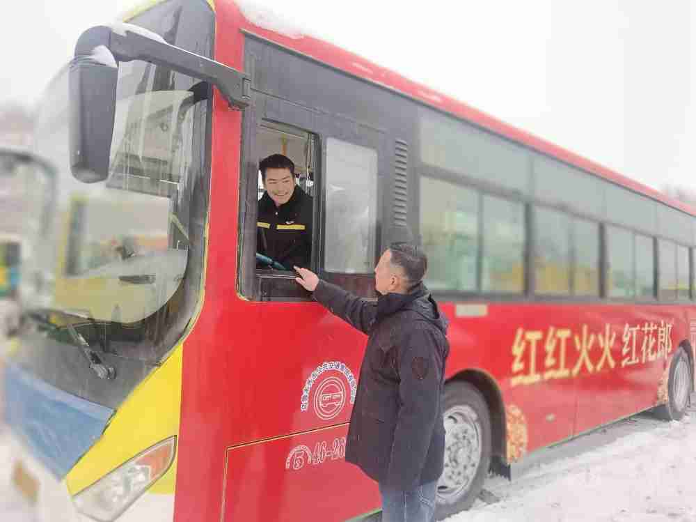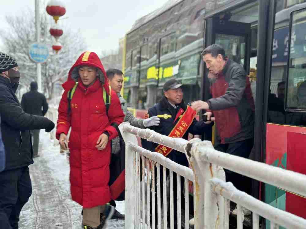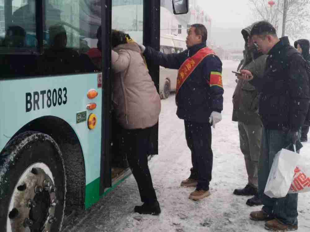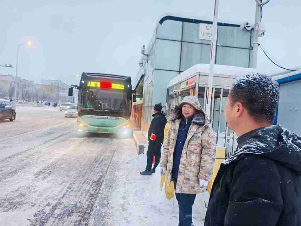 除了现场疏导客流,车队队长还逐一登上待发车辆,仔细检查车内暖气设备运行情况,确保车厢温度适宜,为乘客营造温暖舒适的出行环境。同时,他反复叮嘱当班驾驶员,雪天路面附着力低,务必严格遵守交通规则,做到“降速、控距、亮尾”,谨慎驾驶、平稳操作,时刻关注路况变化,全力保障每一位乘客的出行安全。
