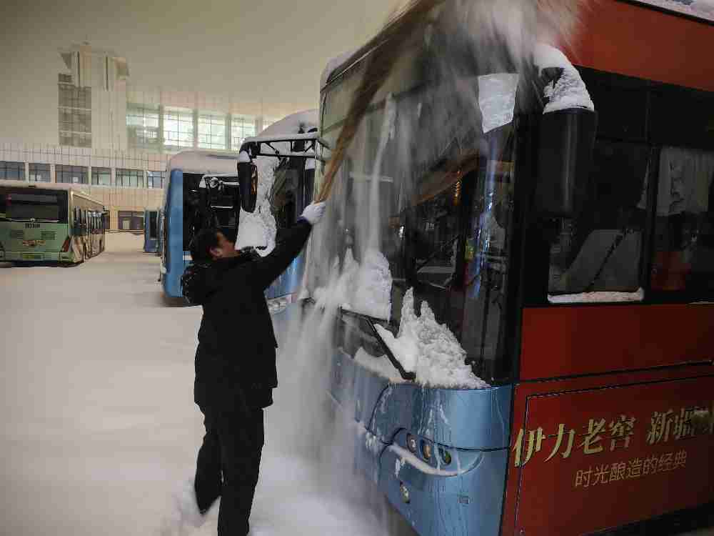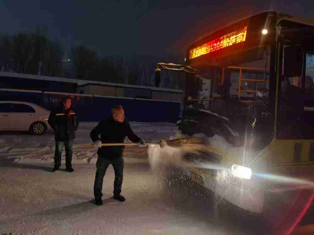 行动中,他们不畏严寒,挥舞着扫帚、推雪板等工具,与驾驶员、后勤人员并肩作战,重点对场站出入口、公交车停车区、车辆门台、轮胎周边及场站主要通行道路的积雪进行快速清理。同时,对车辆的关键部位,如刹车系统、灯光、雨刷等进行了再次检查确认,确保车辆技术状况良好。各车队进一步强化安全叮嘱,提醒驾驶员严格执行冰雪路面安全行车规程,控制车速、保持车距,谨慎驾驶。