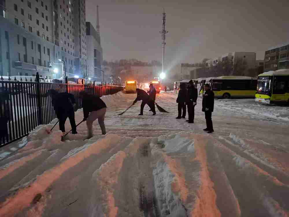 接到降雪预警后,经营六部立即召开极端天气安全部署会,明确责任分工:成立党员先锋队和应急保障队,统筹调配铁锹、推雪板、融雪剂、扫雪车等应急物资,提前对运营车辆的制动系统、灯光、雨刷、暖气等关键设备进行全面检修,杜绝“带病”上路。降雪伊始,10日当晚六部管理干部放弃休息,迅速集结到各场站,展开扫雪除冰工作。大家顶着凛冽寒风,挥舞铁锹、开动除雪设备,重点清理场站出入口、车辆行驶通道,同步在易滑路段铺撒融雪剂和防滑沙,确保车辆进出安全、乘客上下无忧。