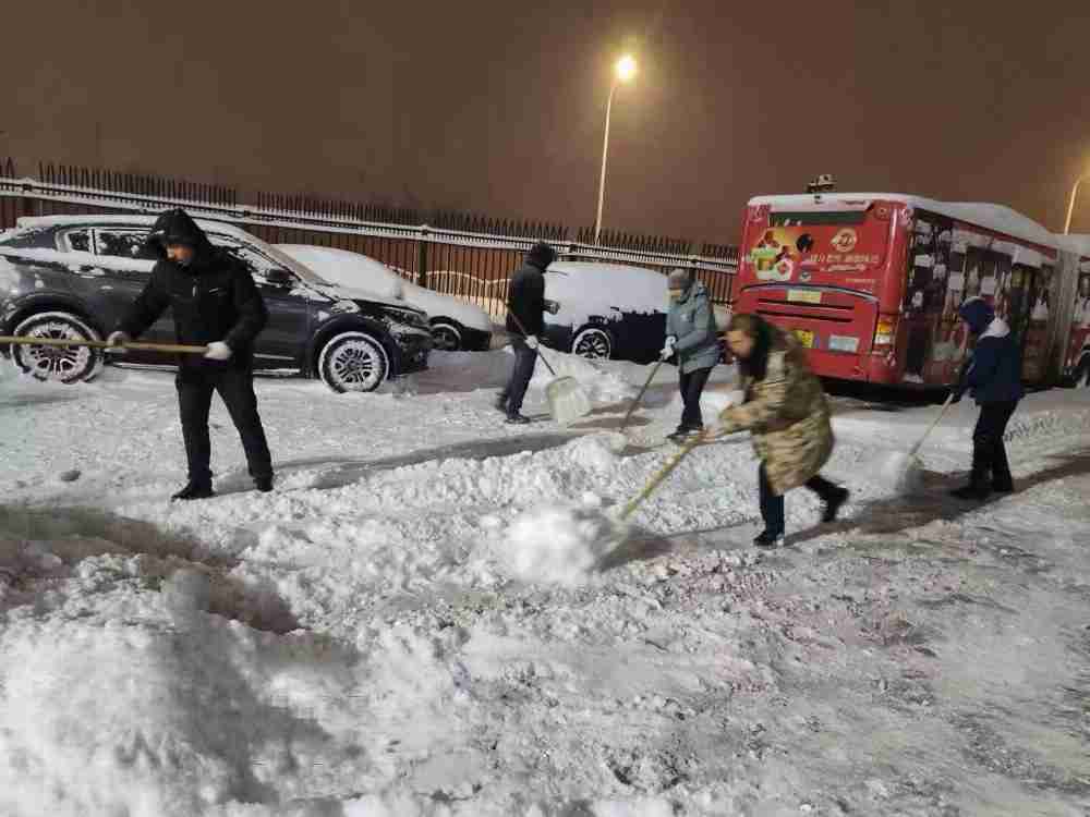 8点19分,经营三部副经理李刚在家佳乐场站,带领25车队班子和机关管理人员挥舞着铁锹,奋力清扫场站积雪,为公交车的安全进出开辟出一条“绿色通道”。