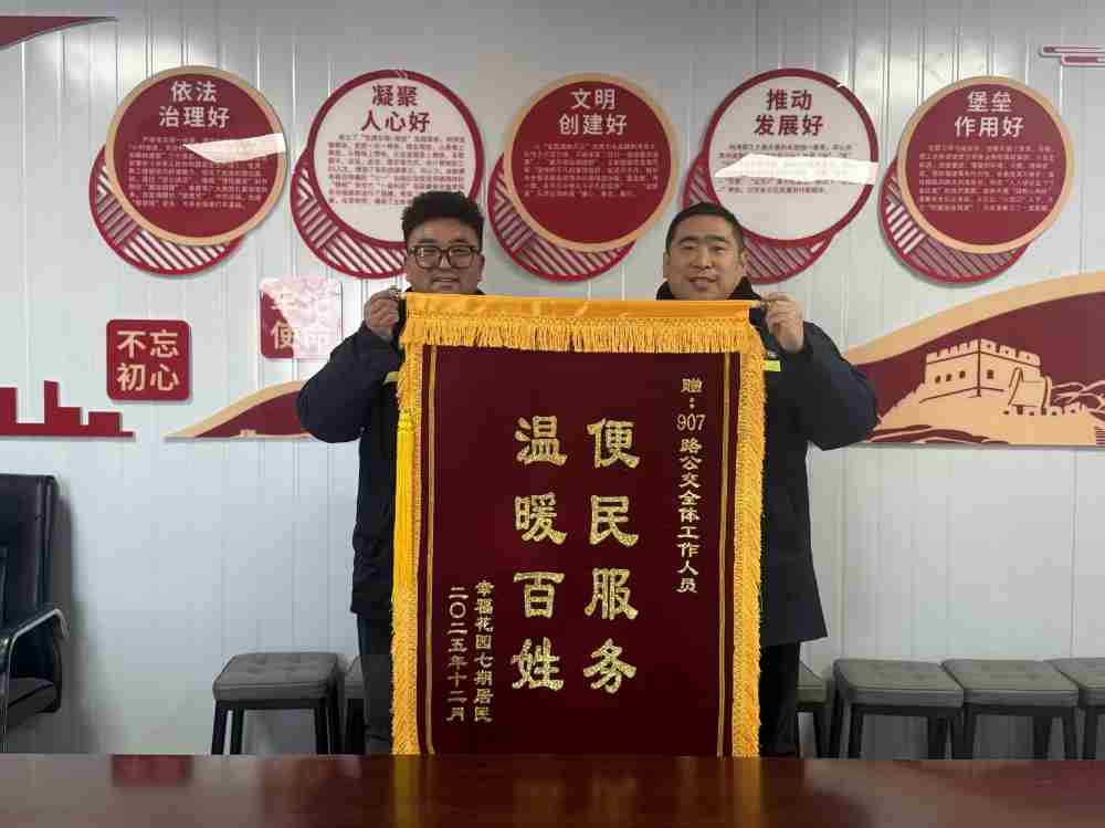 近日,经常乘坐907路公交车上下班的李女士,专程将一面写有“便民服务、温暖百姓”的锦旗送到907路“金雪莲”车队,以此感谢整条线路驾驶员始终如一的优质服务,让她在日常通勤中感受到阵阵暖意。