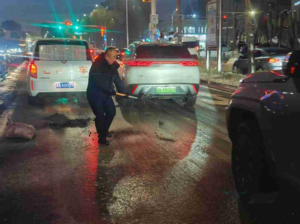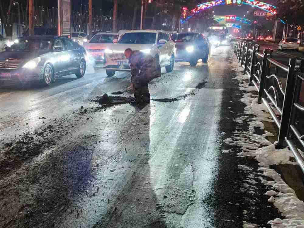 清晨8时许,车队在巡线途中发现,厦门路多处路面出现“地穿甲”现象,车辆行驶时明显打滑。情况紧急,车队立即与公司运营服务科成立党员应急突击队,队员们携带融雪剂、防滑沙、铁铲、扫帚等物资,分三组赶赴现场。此时天色未亮,寒风凛冽,结冰路面已覆盖近200米路段,部分区域冰层厚度达3厘米,过往车辆纷纷减速避让,通行效率大幅下降。
