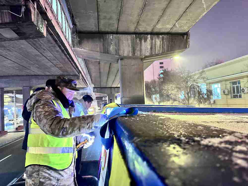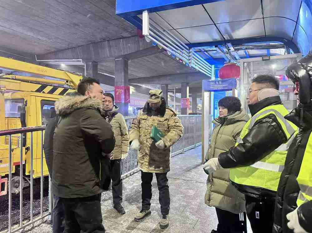 2025年12月26日晚至27日凌晨,快速公交公司党委响应集团公司党委工作部署,在零下14度的严寒中,由总经理陈国龙,副总经理于虎、徐超牵头,组织场站(站务)服务科人员连夜完成13座站台“70周年”庆祝活动遗留装饰物的拆除清理工作。