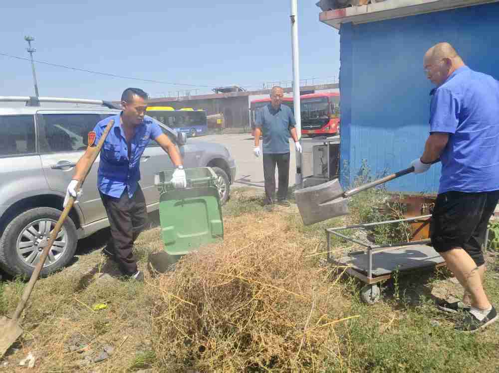 当日,天空高悬的烈日,如一面炽热铜镜炙烤着大地,气象台的高温红色预警,无声宣告着这片大地正经受着高温炙烤。场站围墙边上的杂草,在烈日的炙烤下变得枯萎,不仅显得场站杂乱,也深藏隐患之危——枯萎的杂草在烈日下已化为一点即燃的干柴。科学数据表明,干燥杂草燃点仅约150℃,若遇到废弃烟头等零星火源,顷刻之间,星星之火便能引燃整片枯草,酿成难以扑救的大火。这并非危言耸听,高温天气下杂草自燃、引发火灾的实例并不鲜见。场站里停驻的公交车辆,其油箱、电路一旦遭遇火情,后果不堪设想。场站安全无小事,高温之下,每一根枯草都可能是引燃危险的导火索,每一处垃圾杂物都藏着火患的风险。为清除安全隐患,经营一部六车队组织干部职工齐动手,对三宫七队场站开展环境卫生大整治,共同清理场站杂草、杂物。大家不惧高温酷暑,不怕脏,不怕累,在车队李学虎书记的带领下,各族干部职工,利用趟休时间纷纷加入到清理队伍中来,他们手持铁锹将围墙周围的杂草一一铲除,并清理了因风吹堆积在角落的塑料瓶、垃圾袋、纸屑等杂物,细心搜索场站每一个角落,不放过任何一处隐患。车队副队长周彩华开着三轮车来回奔忙,将清理出来的杂草、垃圾一车一车运到垃圾站。在骄阳下,汗水浸透衣衫,他们用汗水浇熄了潜在的危险,用行动诠释着“防火于未燃”的责任的深度。