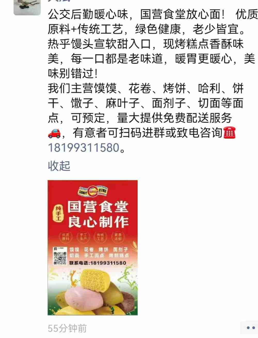倾心献策,精准把握宣传推广方向。结合集团党委委员、副总经理金锐的精准指导、倾心献策,综合运用线上线下多种渠道进行宣传。在集团领导大力支持下,通过发动全体公交干部职工加大宣传力度,大家利用个人微信平台发布对面点产品的宣传推广覆盖范围,其中包括面点品类展示、营养成分介绍、购买联系电话等内容,并配以精美的图片,吸引粉丝关注与互动,进一步提高面点产品知名度和曝光度;其间针对广告宣传展板的版面色调重新设计制作,进一步强化市民对“国营食堂、良心制作”的广告品牌印象,让消费者对公交服务的信任迁移至面点产品。