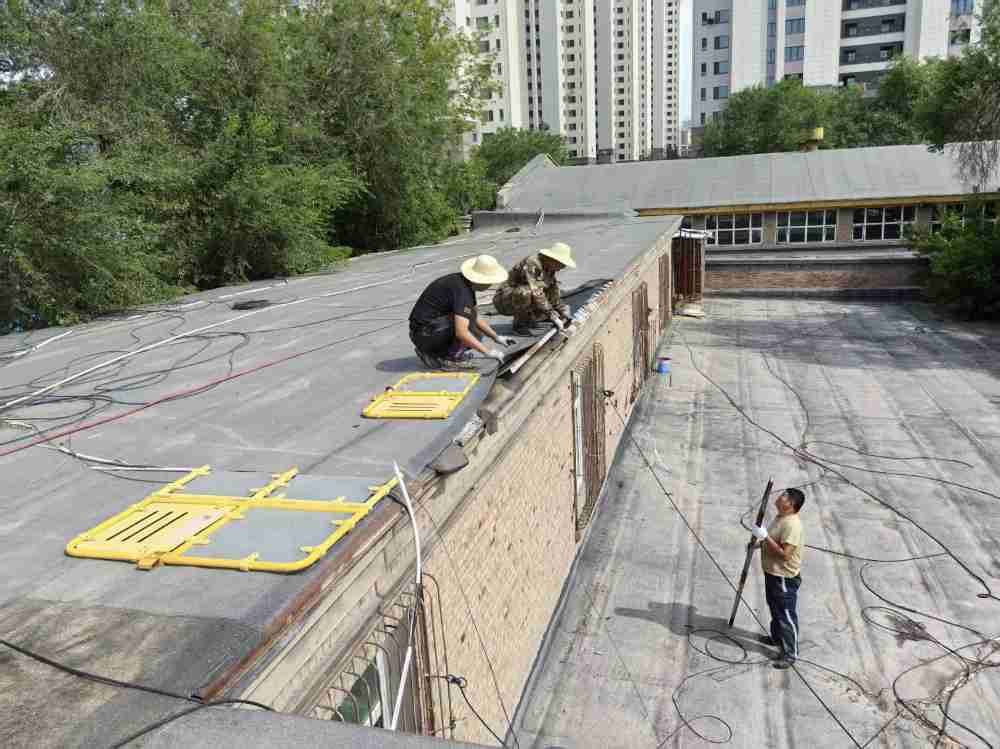 在拆除破损的牛毛毡时,由于其经过长时间的风吹日晒和雨水侵泡,边角与房梁粘连的十分紧密,三人只能用撬棍一点点剥离。为了让新毡贴合紧密、防水性更强,他们跪在发烫的房顶上,用钉子沿着边缘每隔10厘米固定一次,掌心磨出了红印也浑然不觉。直到把最后一段滴水槽固定牢固,才拖着晒软的身子从房顶下来,此时每个人的工作服已被汗水和灰尘浸透,分不清哪是泥垢哪是汗渍。