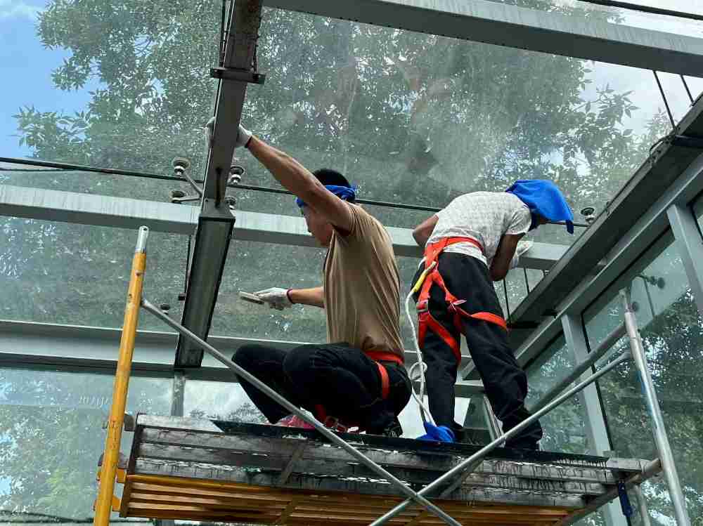 安全运营科工作人员谢玉红手持长铲刀和专用清洁剂,正在认真对污渍胶印进行清理;综合办公室李娟和木巴拉克则站在脚手架上对站台顶端横梁进行擦拭,她们小心翼翼地挪动着脚步,相互配合,一点一点地将横梁上的灰尘和污渍清除干净。另一边,经营发展科王顺站在电梯口上方玻璃墙沿,腰间绑着安全带正在用喷枪冲洗周边玻璃墙上的顽固污渍,他的动作专注而谨慎,边边角角的冲洗都力求彻底,确保不留任何死角。