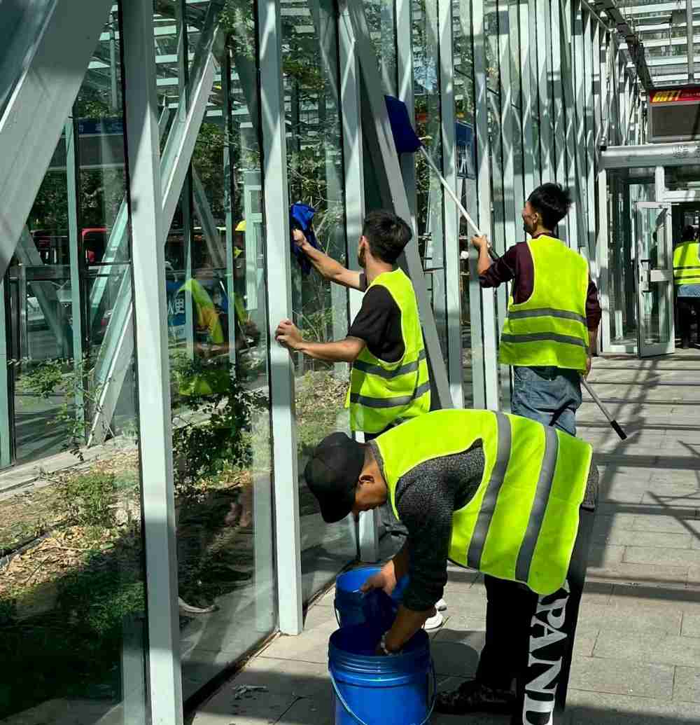 长期暴露于户外环境的BRT站台顶部,面临着严峻的清洁挑战。大量灰尘及空气悬浮颗粒物、雨雪残留痕迹长期积累,部分区域布满鸟粪、落叶,甚至还有少量胶带、涂鸦痕迹。针对这些问题,大家利用工程登高车少量多次运送清洁用品、清洗工具等,并由副经理周金锐带领3名学员来到站台顶部,先使用泡沫枪喷洒少量清洗剂,再用拖把、长柄刷等工具清理表面浮尘和杂物;针对鸟粪、胶带、涂鸦等顽固污渍,使用铲刀、专用清洁剂进行预处理,再用进行二遍冲洗、擦拭。经连续作业攻坚,站台顶部积尘、污渍全面清除,亮洁亮洁度显著恢复,公共空间视觉品质大幅提升。