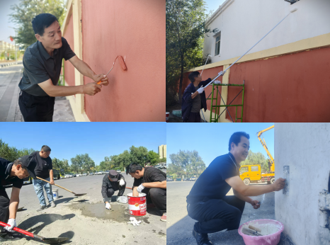 粉刷修缮过程中,党员突击队志愿者主动承担最繁重的工作任务,率先垂范。发扬不怕脏、不怕累的精神,分工协作,默契配合。有人负责清理墙面灰尘、铲除剥落旧漆,有人细致做好门窗、设备的遮盖防护,还有人手持滚筒和刷子,对墙体、护栏、停车标识线等进行均匀粉刷。尽管天气炎热,汗水浸湿了衣衫,但大家的劳动热情高涨,现场气氛热烈融洽。