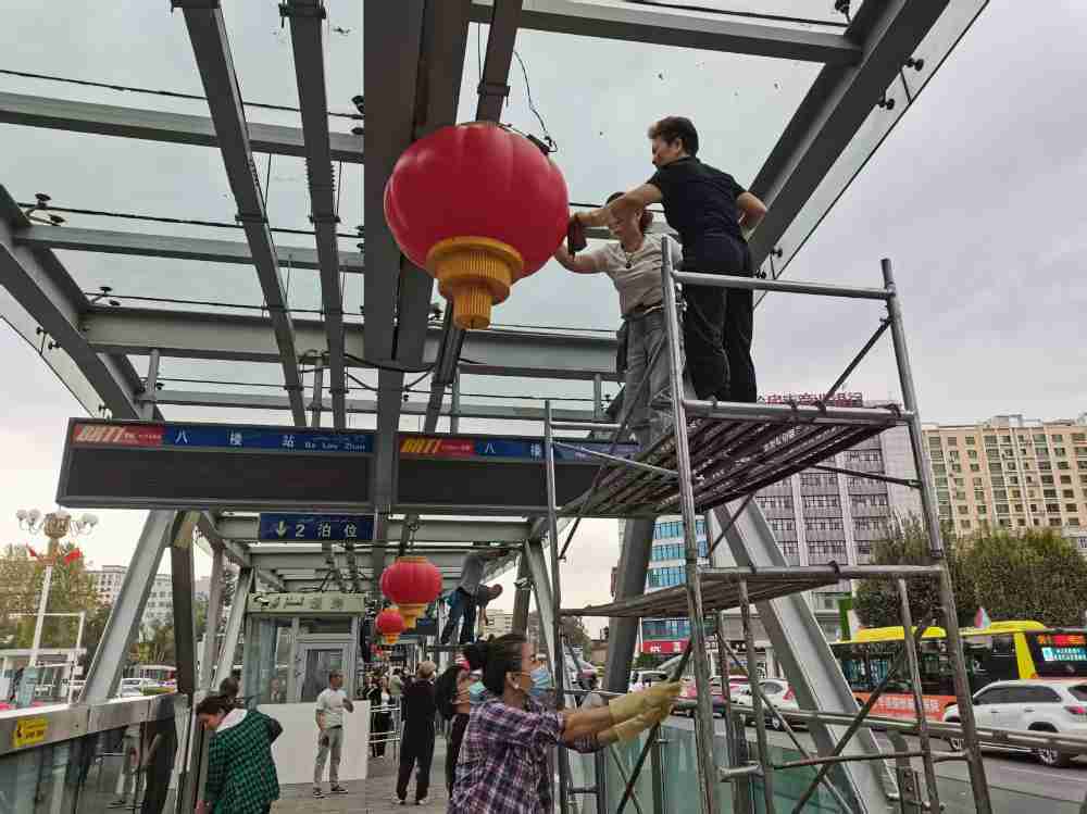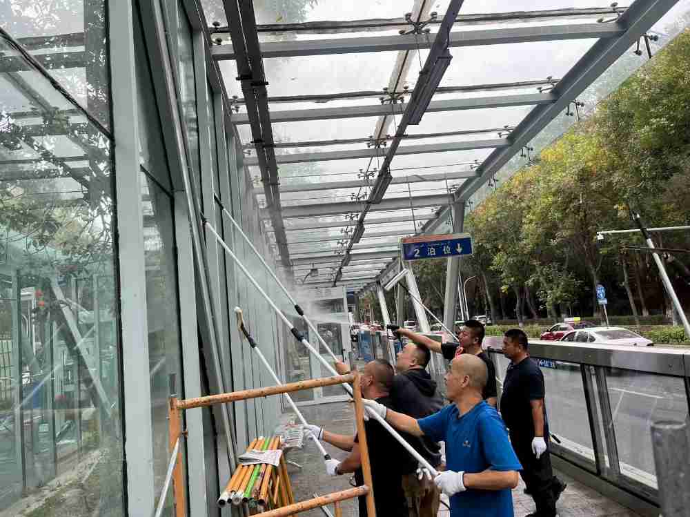 清洗现场,一派热火朝天的劳动景象。工作人员们分工协作,手持高压水枪、玻璃刮、长柄刷、抹布等专业工具,前面有人用高压水枪冲刷着积尘,后面有人用玻璃刮擦干水渍,对顽固污渍再次喷上清洗剂一点点地仔细擦洗。上到站台的顶棚,下到每一根立柱、每一块玻璃幕墙、每一扇屏蔽门、每一张座椅、每一块标识标牌、每一个垃圾桶、每一个边边角角、每一个缝隙凹槽以及暖房暖风机的防护网等每一个部位、每一个细节都进行了全方位的清洗和擦拭。连入口处镂空幕墙上的每一个凹槽和空洞里的灰尘都仔细的一个一个的进行了掏洗,清洗干净后又对镂空幕墙、立柱钢架等锈蚀部位进行打磨喷漆;并对破坏、退色的标识进行更换,公交人以严谨细致的“绣花”精神在细节上下功夫,确保高质量高标准完成此次美化亮整治工作。为不影响市民出行,工作人员连夜奋战,初秋的深夜凉风习习,劳动的汗水依然湿了衣背。经过大家辛勤付出,一个个BRT站台旧貌换新颜。明亮的玻璃映照着蓝天白云,光洁的玻璃墓墙侧映着匆匆身影,大红的灯笼随风摆动,整洁的环境让人眼前一亮。