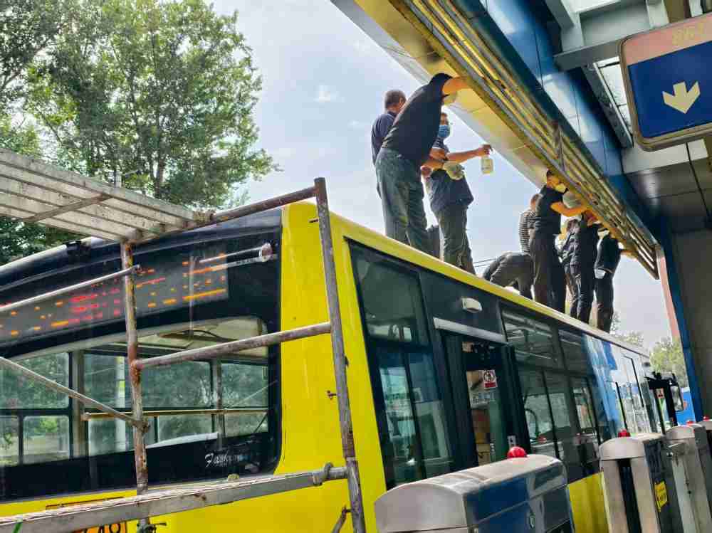 为保障此次翻新及清洗工作高效开展,经营四部调派1辆拖车及2辆公交车,保证站台外侧玻璃及梁框的清洗和粉刷。在经理惠全练的指导下,几名男同志站在车顶,先用砂纸打磨锈迹、去除污垢,再用抹布擦掉浮灰,最后再进行油漆粉刷。大家分工明确,一套程序行如流水,一气呵成。针对站台内横梁框架、台位指示灯箱、暖房、监控摄像头等重要设施,身形比较匀称的中等个儿男士利用脚手架、人字梯等工具进行登高,细致入微的擦拭每一处,几位女同志则扶稳脚手架、梯子或及时清洗抹布。站台墙面、路牌灯箱、安全门,站内智能屏、百叶窗、闸机、垃圾桶、灭火器、座椅、地面花池杂草等……大家不放过每一个角落,不怕脏、不怕累、不埋怨,个个干劲十足,细致认真。