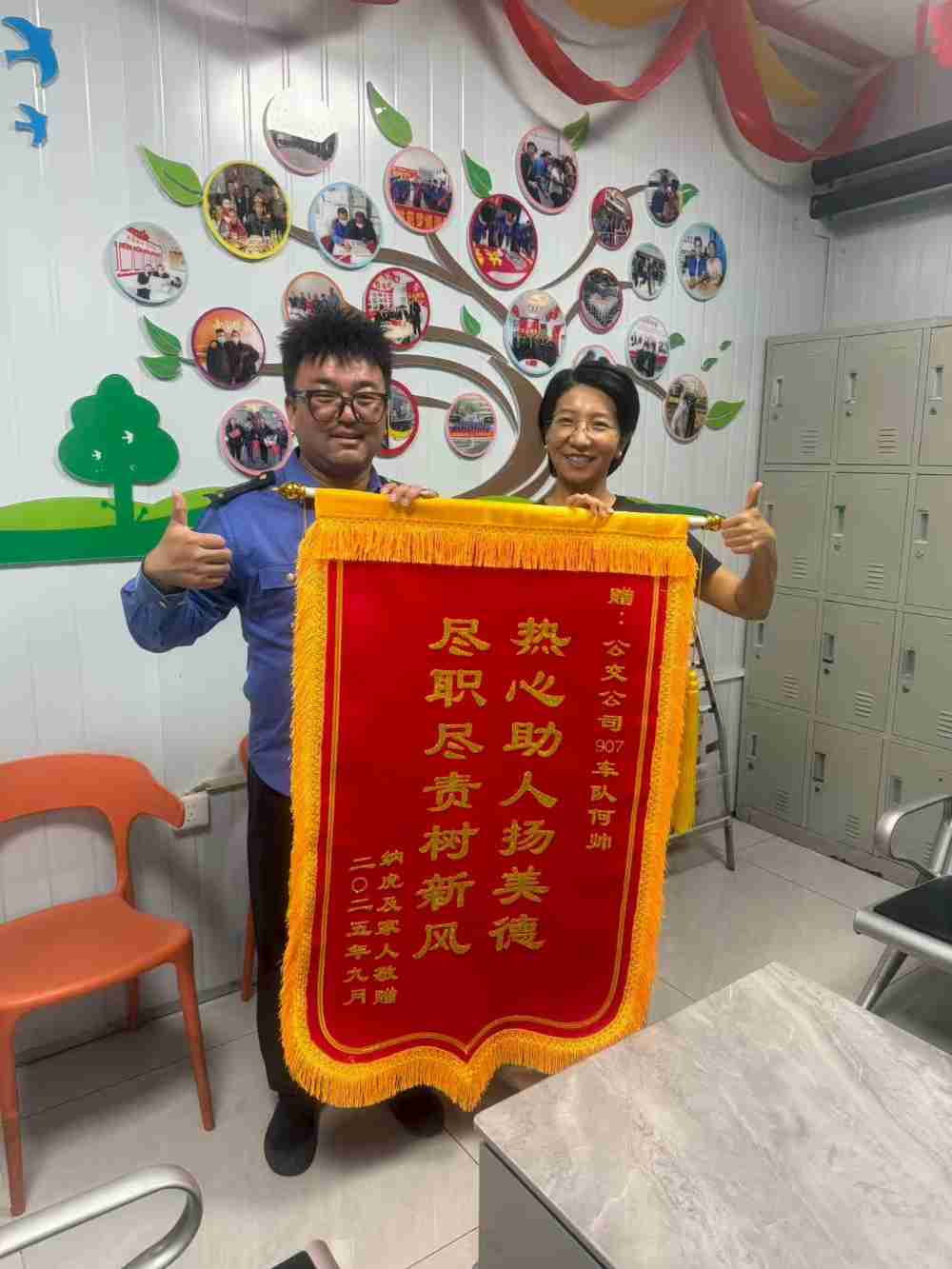 面对焦急无助的孩子,“雪莲王”何帅师傅迅速冷静下来。他一边安抚女孩情绪,一边紧急联系站调人员,详细说明女孩的乘车地点、体貌特征及大致情况,积极联系其家人。为防止女孩途中误下车,何帅特意让她坐到驾驶室旁的座位,确保孩子始终在自己的视线范围内,用细心筑牢安全防线。经过与站调人员的紧密联动,最终成功联系上女孩的父母,将孩子安全交到家人手中。次日一早,孩子母亲带着一面印着“热心助人扬美德,尽职尽责树新风”的大红色锦旗专程来到车队,紧紧握住何帅的手反复道谢。面对这份热忱,何帅师傅腼腆地摆摆手说:“这是我们公交人该做的,孩子平安比啥都重要”。