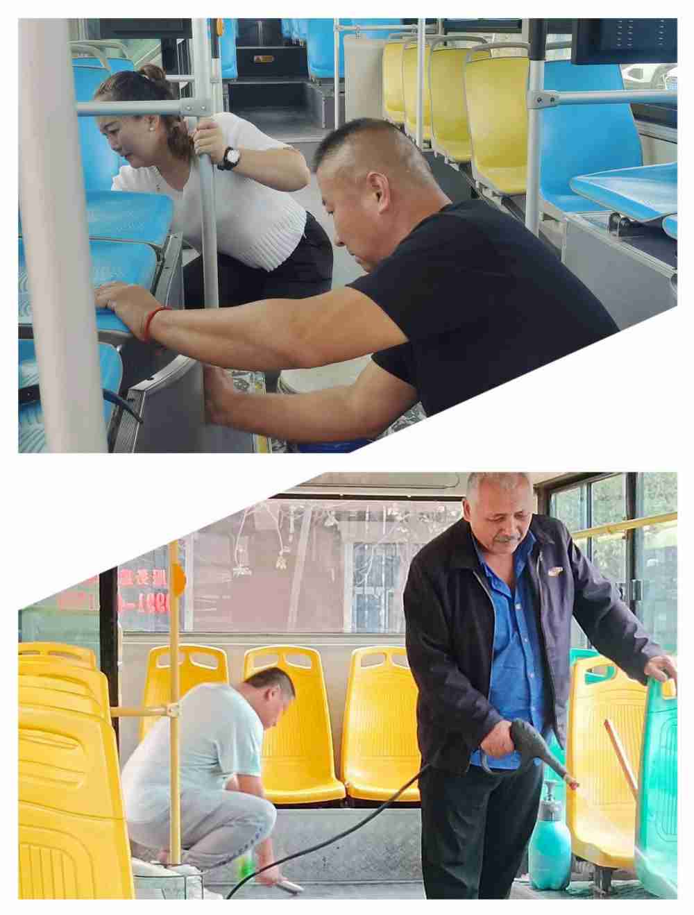 在维斯特站点,106 路公交车上,车队党支部书记梁乙泉与驾驶员雷志丽组成了“攻坚搭档”。面对座椅底部狭窄缝隙里的灰尘和垃圾,常规的清洁工具根本无法触及。梁乙泉灵机一动,迅速找来一块海绵和一根木棒,将海绵紧紧地绑在木棒上,一个简易却实用的“瘦身清洁器”便诞生了。他俯身跪地,将“瘦身清洁器”小心翼翼地伸进缝隙里,一下又一下地反复擦拭。每一次擦拭,都带着满满的专注和认真,仿佛在完成一项神圣的使命。不一会儿,密密麻麻的汗水就布满了他的额头,顺着脸颊不停地流下来,打湿了他的衣衫。但他只是抬手擦擦汗水,便又继续投入到“战斗”中,那专注的神情,让人不禁为之动容。