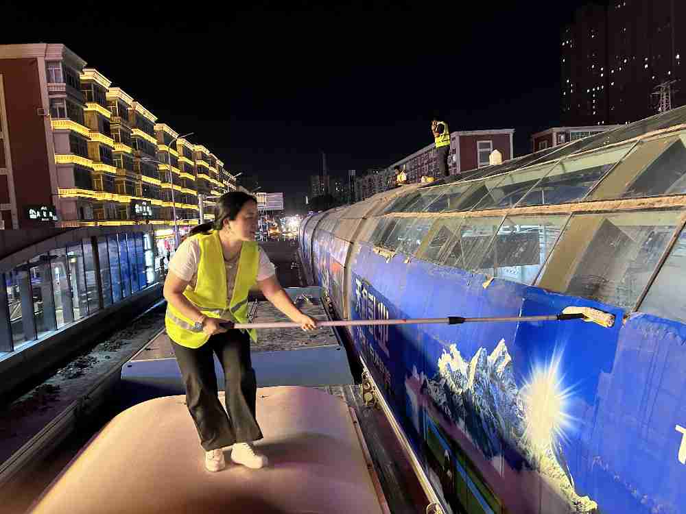 深夜的高新街站台,站务人员化身“玻璃清洁师”。他们登上站台顶部,先用油污净喷洒顶棚玻璃内外,再用长排拖仔细刷洗,最后将污渍与泡沫彻底冲刷干净。当清晨第一缕阳光穿透洁净的玻璃洒落,整个站台便在光亮中迎来新的一天,这份深夜的坚守,换来了清晨的明朗。
