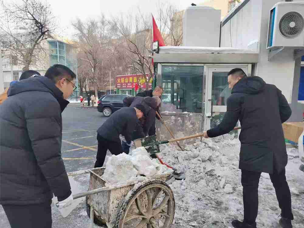 1月6日下午,党员同志们携带铁锹、扫帚、垃圾袋等工具,准时抵达指定地点。集团公司总经济师(兼总法律顾问)李鑫与党支部书记张平首先对活动任务进行明确分工,将党员分为扫雪除冰组和卫生清扫组,确保各项工作有序推进。扫雪除冰组的党员同志们不畏严寒,迅速投入到积雪清扫工作中,大家齐心协力、相互配合,有的用铁锹铲除路面厚实的积雪和冰层,有的用扫帚将松散的积雪清扫至路边,不放过任何一处易滑路段,全力打通出行安全通道。卫生清扫组则重点对集团出入门口、周边绿化带等区域进行全面清理,捡拾散落的垃圾、杂物,有效改善了办公楼周边的环境卫生状况。