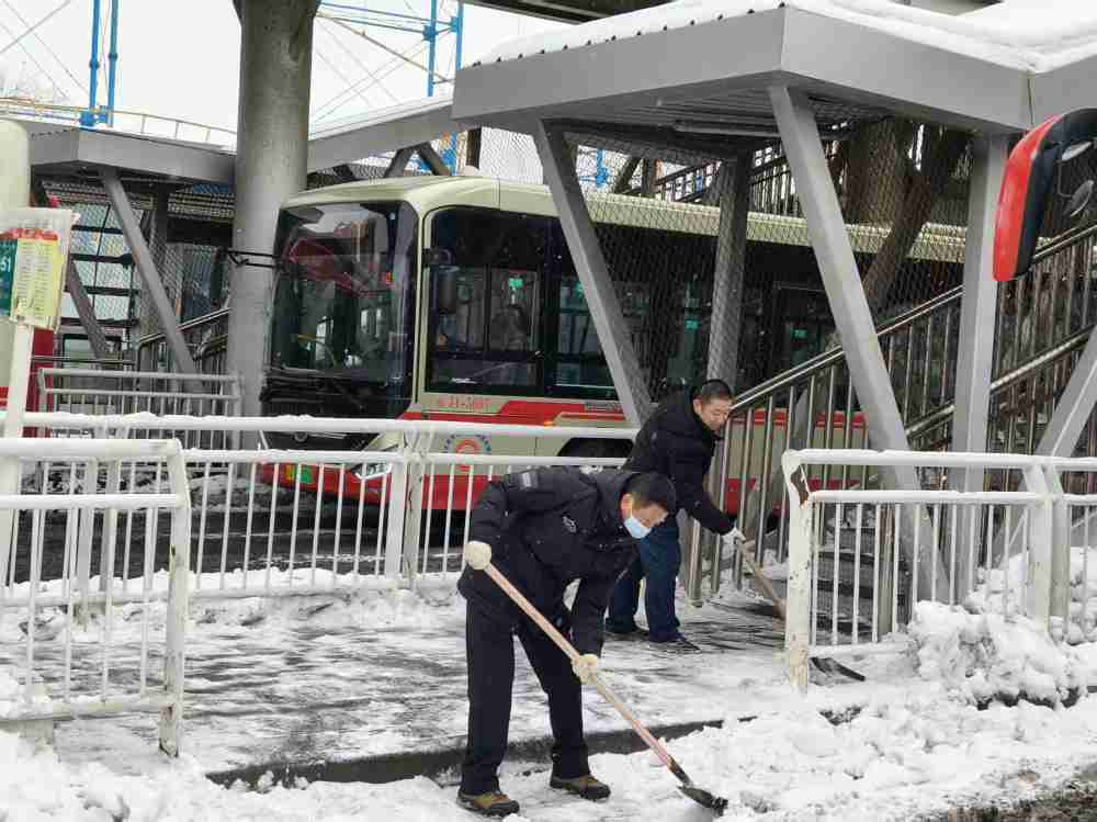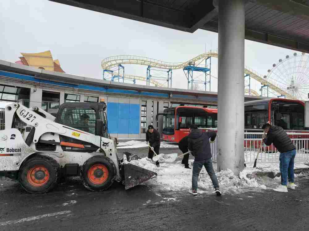 三屯碑公交停车场因场地构造特殊,场内分布三处过街天桥出口、四处车站通道,积雪零散不均、作业区域错综复杂,清理难度远高于其他停车场。面对艰巨任务,中心立足新年工作要求,以“开局即决战、起步即冲刺”的奋进姿态,统筹部署、科学施策,在严格落实人机协同作业模式的同时,同步筑牢全程作业安全防线。作业中,针对机械无法抵达的天桥下、天桥两侧及通道拐角等死角区域,干部职工分组包片、手持铁锹、扫帚等工具人工攻坚;开阔区域由机械主力推进,实现铲雪、装车、转运一体化高效作业。寒风凛冽中,全体人员分工协作、干劲十足,重点对车辆进出口、乘车口、候车区等关键区域的积雪积冰进行彻底清理,有效预防车辆打滑及市民上下车磕伤等安全风险。针对傍晚气温骤降、积雪易结冰的不利情况,作业队伍及时优化作业流程、加密清理频次,累计转运积雪8车次,场内积雪被全面清理、不留死角,为公交车辆正常运营、市民便捷出行筑牢了坚实的安全保障。