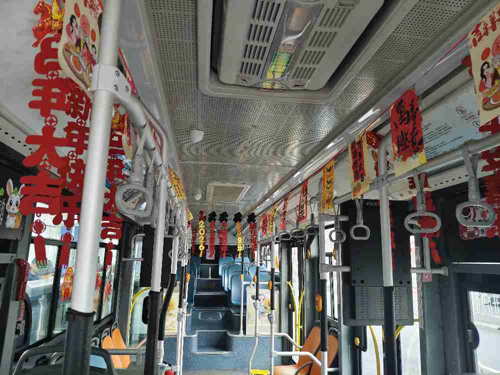 走进朱丽容驾驶的这辆BRT2号线公交车,“马”年的节日氛围扑面而来,车窗上贴着“马年吉祥”“新年快乐”的祝福语,扶手栏杆上缠绕着鲜艳的拉花。车队队长刘方表示:春节不仅寓意着团圆,还寓意着新的希望,装扮新春车厢,不仅是为大家营造一个新春过年的氛围,更是我们对各族乘客送上的真挚祝福,希望大家平平安安回家,快快乐乐过年!