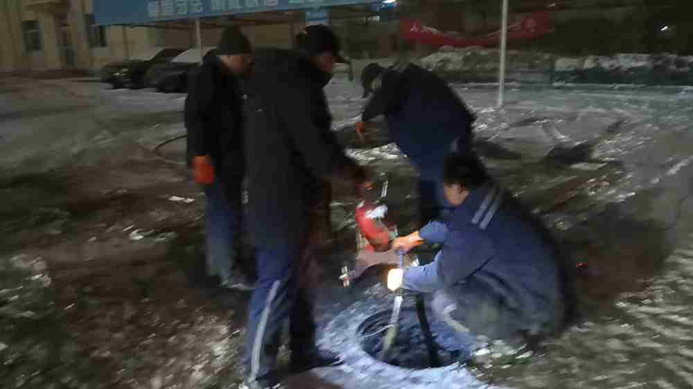 当日室外气温低至零下20余度,寒风刺骨、呵气成霜,地面凝冰湿滑。面对被油污与杂物彻底淤堵的窨井,维修师傅们不顾刺鼻异味与脏污,毅然俯身掀开井盖,手持工具深入井内反复搅动、清掏。冰冷的工具冻得双手发麻,他们便搓手哈气短暂缓解后继续奋战;身上溅满的油污水渍,在寒风中迅速凝结成薄冰,紧贴衣物却无暇擦拭。从暮色四合到深夜时分,维修人员始终坚守现场、连续作战,凭借过硬的专业技能与顽强的毅力,历经4小时不懈攻坚,于22时成功完成4个下水窨井的全面疏通,让食堂下水系统恢复顺畅运转。