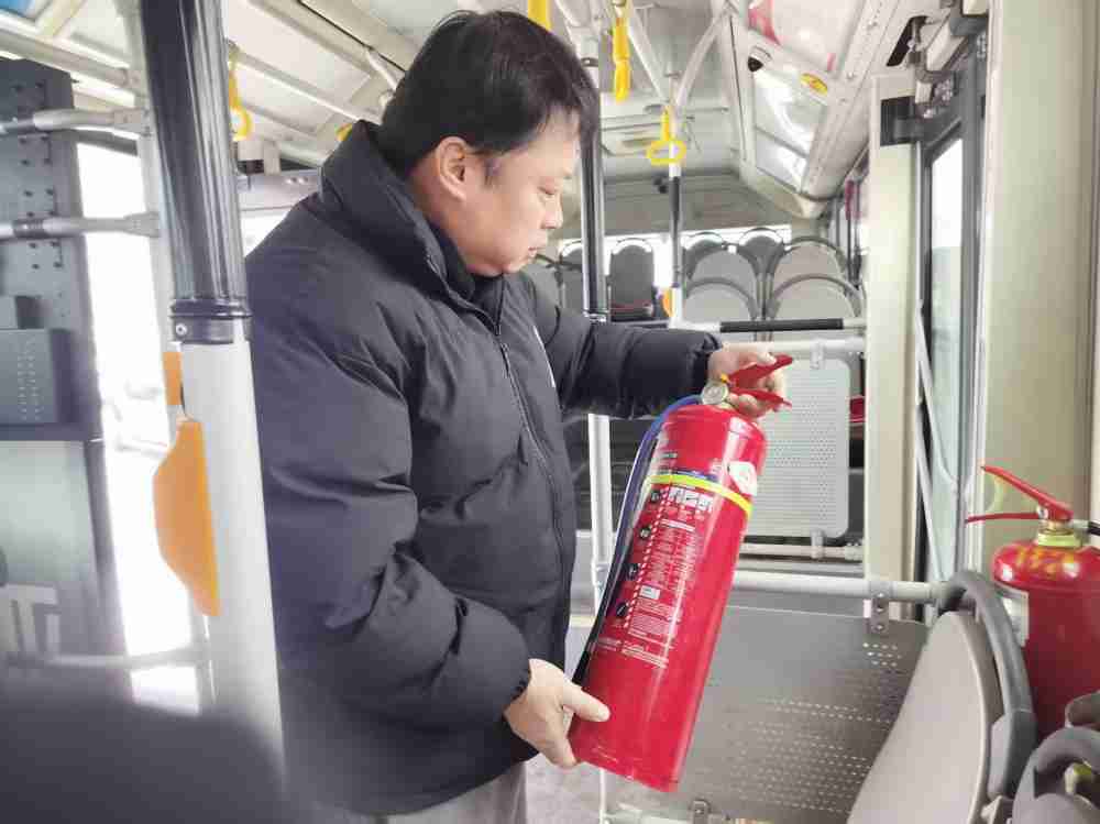 检查过程中,李振斌以身作则、带队深入一线,与驾驶员穿梭在各运营车辆之间,对每台运营车辆的灭火器进行细致核查。针对灭火器压力是否正常这一核心要点,他手把手指导工作人员精准识别压力表指针状态,对指针处于红色区域、压力不足的灭火器当场标记;对瓶身锈蚀、胶管开裂、阀门失灵的灭火器,一律纳入更换清单;对临近到期的灭火器,坚决做到即查即换,绝不允许“带病”灭火器上车运营。排查中,李振斌还注重细节把控,同步检查灭火器放置位置是否规范、固定是否牢固、取用是否便捷,确保遇有突发情况时,驾乘人员能够快速取用、有效处置。