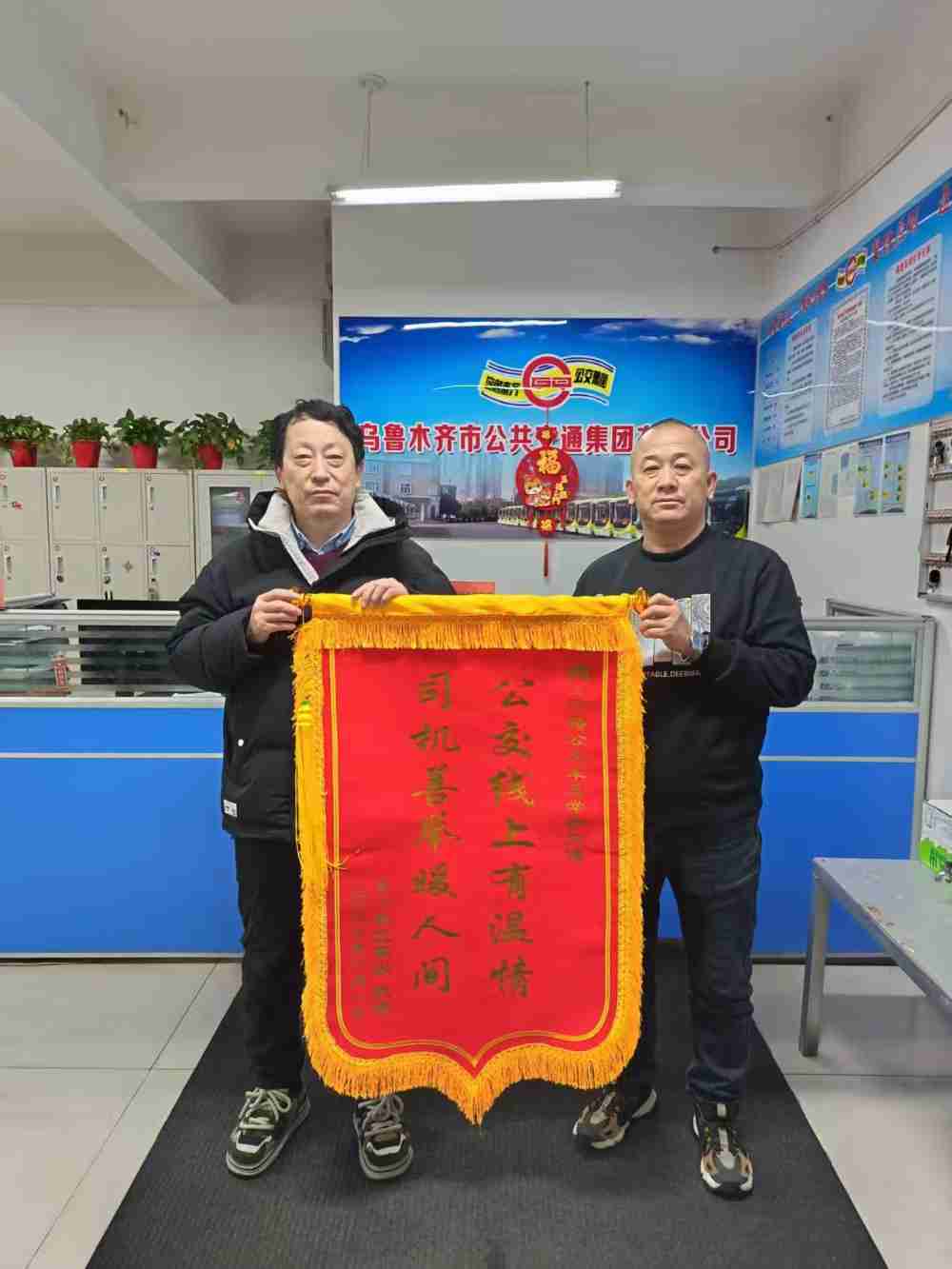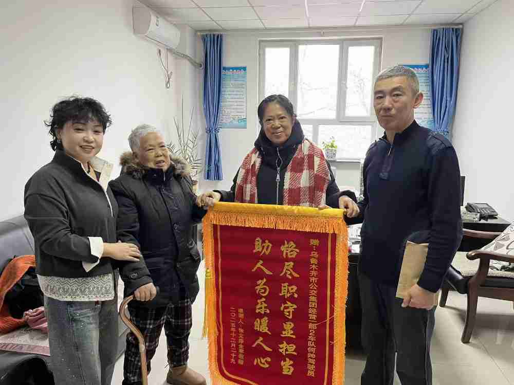 考虑到老人可能存在沟通障碍,何帅放慢语速、耐心询问,试图获取老人的家庭信息。经过多次温和引导,终于从老人模糊的表述中捕捉到关键线索,并成功联系上老人家属。在等待家属的过程中,何帅始终陪伴在老人身边,悉心照料,缓解老人的不安。当心急如焚的家属赶到现场,看到老人安然无恙时,激动不已,紧紧握住何帅的手连连道谢。事后,为表达深切谢意,家属特意撰写了表扬信并制作了锦旗,亲自送到公交集团经营一部“金雪莲”车队,向何帅师傅及车队致以诚挚的感激。最终,何帅亲手将老人交到家属手中,确保老人安全归家后,才重新投入到营运工作中。