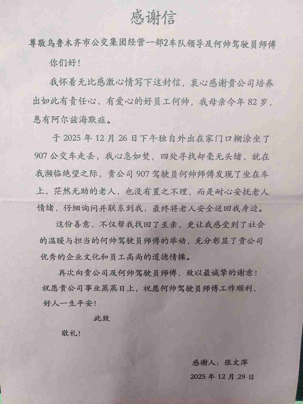 2025年12月26日下午,公交集团经营一部“金雪莲”车队907路驾驶员何帅,在营运过程中暖心救助一名走失老人。他以细致入微的观察、耐心周到的服务和强烈的责任担当,成功帮助患有阿尔兹海默症的82岁老人平安归家,用实际行动彰显了“金雪莲”车队“守善”线路的服务初心与“乘客至上、服务第一”的优良品质。
