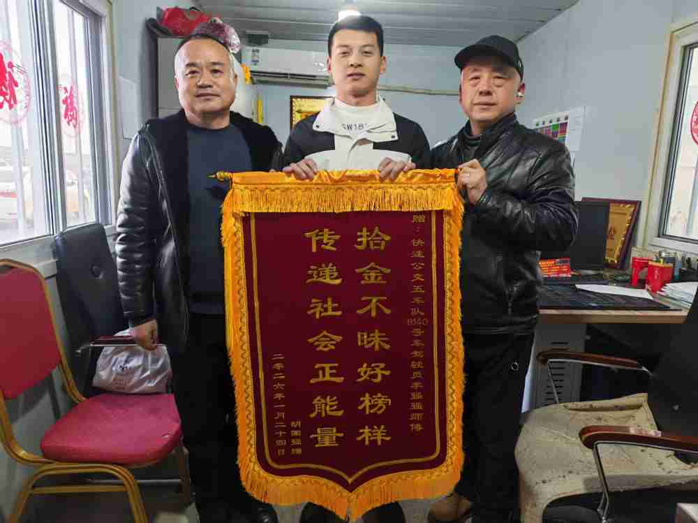2026年2月3日,在良种站停保场五车队办公室里,失主胡国强对7号线8140驾驶员李强强和车队郑书记说道:“太感谢你们了,这部手机对我而言至关重要!”他紧紧握着驾驶员李强强的手,激动地表达感激之情,并送上一面写着“拾金不昧好榜样、传递社会正能量”的锦旗。