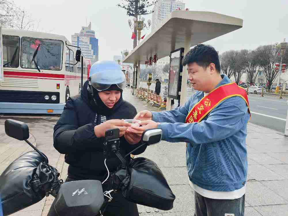 活动现场,市民王新踊跃参与猜谜,趣味谜面引得大家驻足思考、热烈讨论。志愿者马晓娟为猜对谜底的乘客送上精美小礼品,暖意融融。乘客纷纷表示,活动将传统文化、出行体验与文明宣传有机融合,既增添了年味,又丰富了旅途感受。同时,后勤服务中心志愿者为坚守在岗位的外卖小哥与环卫工人,传递节日温暖与关怀,将一碗碗热腾腾的元宵送到他们的手中,让他们在烟火气中感受节日温情。