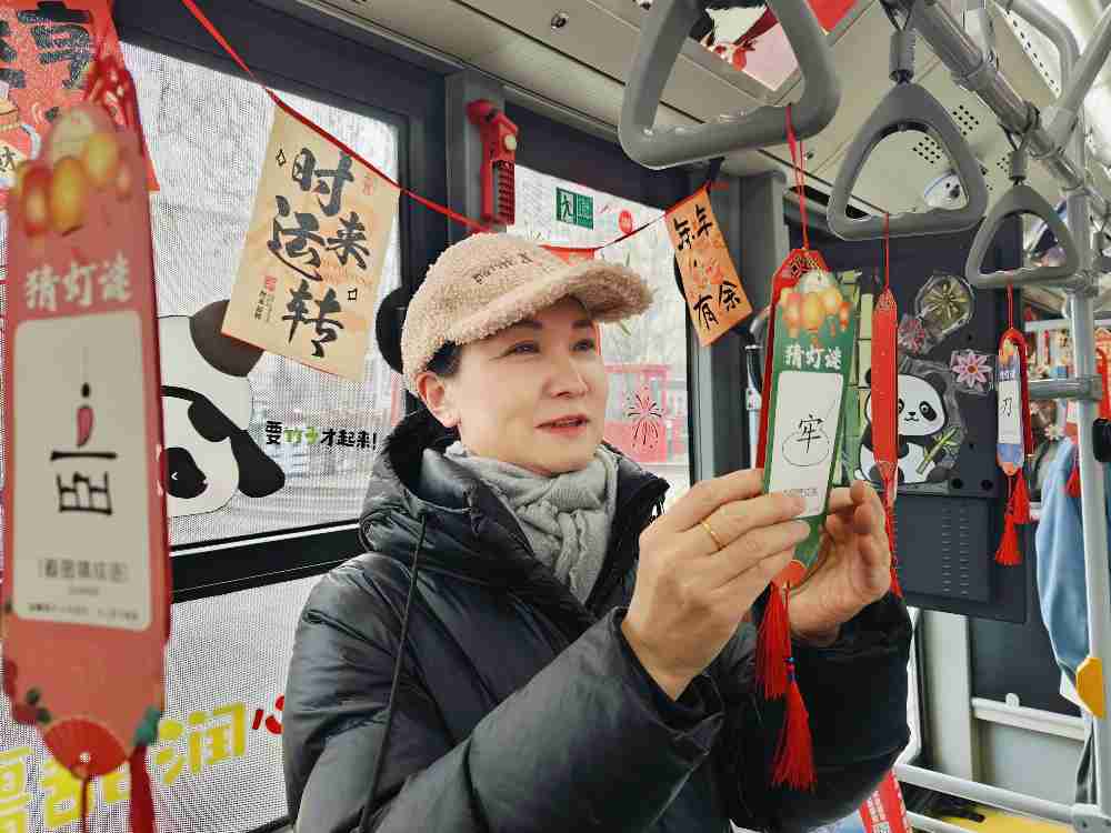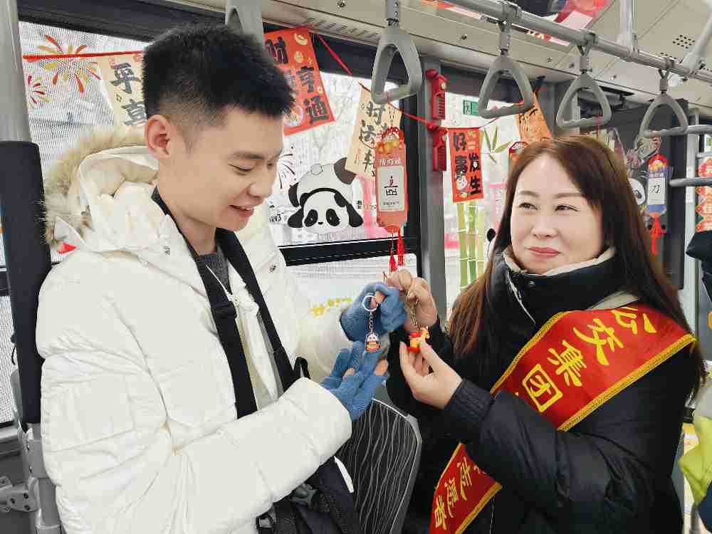 互动欢乐闹车厢 便民服务暖人心。 活动现场,趣味十足的熊猫灯谜挂满车厢,内容巧妙融合民俗文化、熊猫知识与文明出行理念。志愿者蒋红侠围绕入住三屯碑的熊猫名字、食性特点、保护知识等开展轻松互动问答,乘客们踊跃参与、争相作答,现场气氛热烈温馨。大家在欢声笑语中学习科普知识、感受国宝魅力,精美小奖品更为节日增添满满喜气。重庆游客李豪一上车就被浓厚的节日氛围打动,原本普通的出行,变身一场温馨有趣的元宵体验。他兴致勃勃地参与猜谜与熊猫知识问答,接连答对多题,顺利领到精美的熊猫钥匙扣和马年钥匙扣。他由衷感慨:公交不仅方便出行,还如此用心用情,让大家在路途中也能感受到团圆与欢乐,这座城市的温度,就藏在这小小的车厢里。