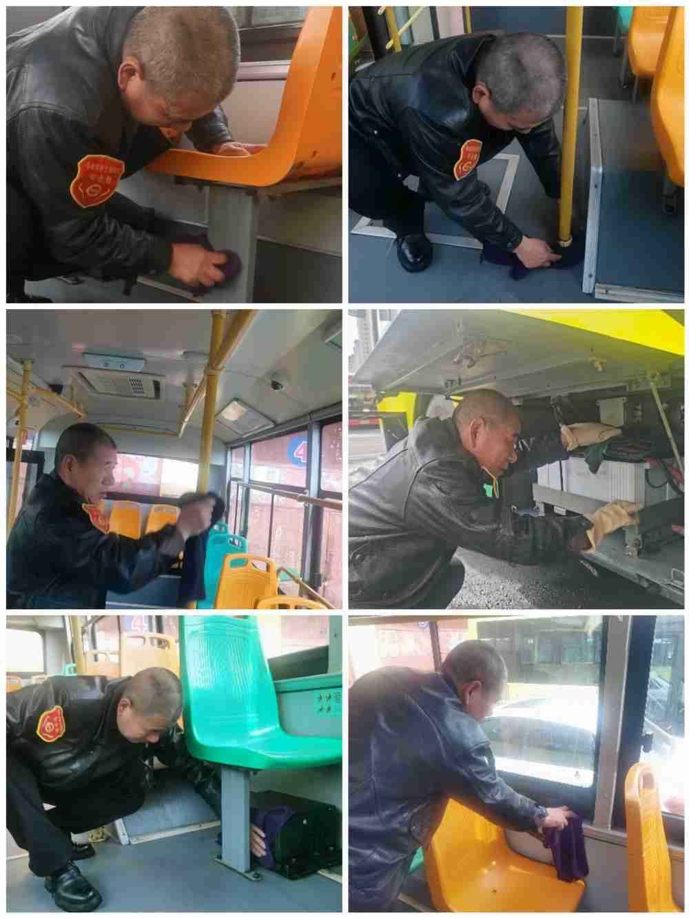 车厢里,有人蹲在地上一点点耐心的扣除地板上的口香糖胶、有人用刷子刷洗门轴后沉积的泥渍、有人用木棒绑裹上湿布子掏擦钱箱后面缝隙和暖气夹层里、座椅底下死角的污垢、有人将垃圾桶内胆拿出来仔细的刷洗,有人用抹布一遍遍擦洗着扶手、扶杆凹槽里的污泥,车厢外,驾驶员师傅们仔细清理着电瓶舱、锅炉舱等机舱及车窗、外皮卫生………最考验耐心的是机器油污,难清理,驾驶员师傅们半跪在地上,用小板刷蘸着清洁剂,一点一点刷洗着那些平时难以触及的死角。原本附着在机件上的陈年污垢,在反复刷洗下渐渐消退,露出了机器的原本底色。从车厢里到车外,从一眼能看到的地方到犄角旮旯的死角,师傅们干起活来一丝不苟,用汗水把公交车收拾得清清爽爽。