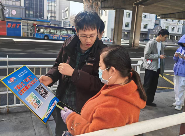 在公交车站宣传现场,工作人员在南湖西路、西虹东路、南湖南北路等路段沿线站台设立宣传点,架起宣传展架,手持宣传册,主动向候车乘客讲解APP核心功能。针对老年群体、外来务工人员等重点人群,工作人员手把手指导扫码下载、注册绑定等操作流程,耐心解答各类疑问,确保群众熟练掌握。
