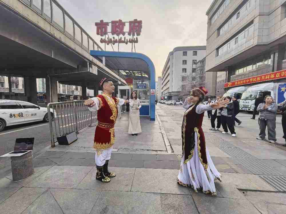 活动开场,麦力克扎提一曲《最美的还是我们新疆》悠扬地唱响。熟悉的旋律刚落,参演员工赛依丁·沙吾提便踩着节奏走了进来,舞姿轻盈灵动。每一个动作都带着活力,也带着对家乡的热爱。窗外路过的行人忍不住停步,隔着玻璃看得入迷,手机纷纷举起来,拍下这一段快乐瞬间。
