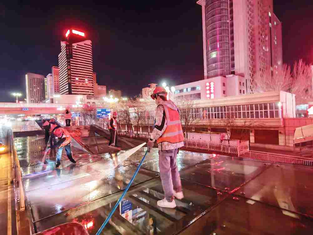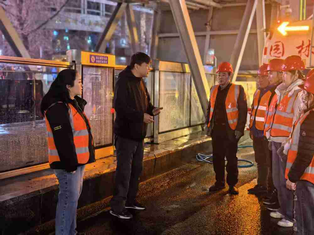 此次专项清洗作业始终坚持民生优先、服务至上原则,充分考虑白天公交正常运营秩序及市民日常乘车需求,精准选择夜间停运后错峰开展,全力实现保洁作业与运营服务“两不误、两促进”。清洗作业现场,场站(站务)服务科科长马春率先垂范,第一时间对全体作业人员开展安全警示教育与作业规范培训,反复强调安全作业要求,细致讲解清洗操作流程、高空作业注意事项,牢牢守住安全生产底线,为专项清洗工作有序推进筑牢安全根基。作业人员身着统一反光背心、头戴照明头灯,规范登上登高车开展作业,创新采用“高垂低挂”作业方式,对站台顶部、侧立面等易积尘区域进行逐片、逐点细致清洗,针对高处卫生死角、顽固污渍等清理难点,坚持高标准、严要求,不放过任何一处细节,确保全方位、无死角清洁到位,全程做到安全规范、作业高效、洁净达标。
