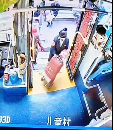 当时,白丽黎师傅正驾驶车辆行驶至平川路口。细心的她发现站台上有一位头发花白的老人,身边放着一个装得满满当当、看上去沉甸甸的买菜推车。老人试图将推车拎上车,但由于年事已高且物品较重,显得十分吃力。